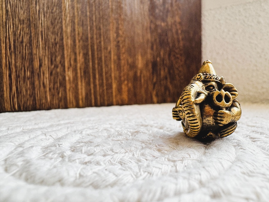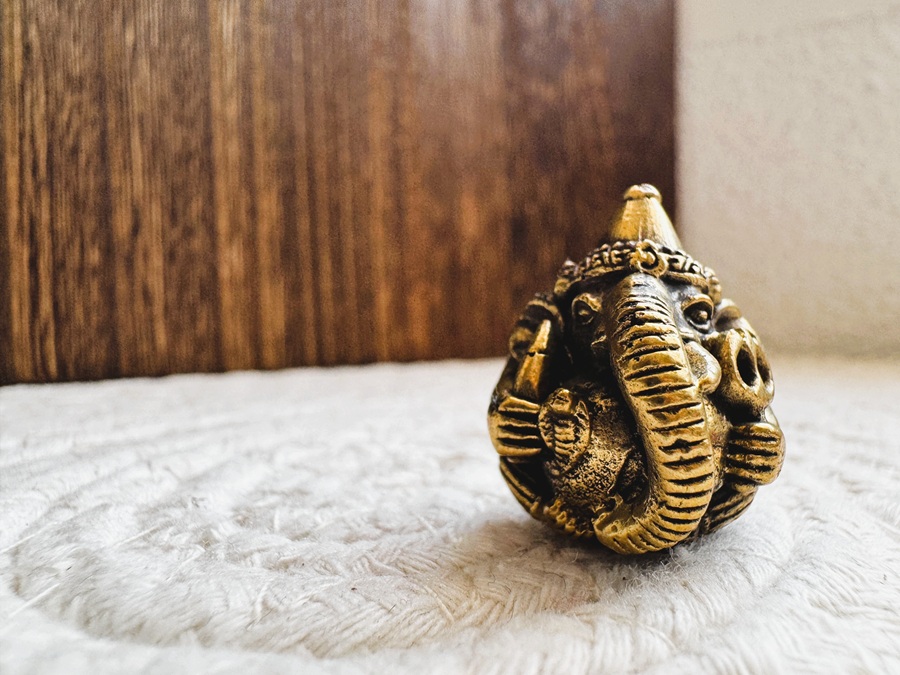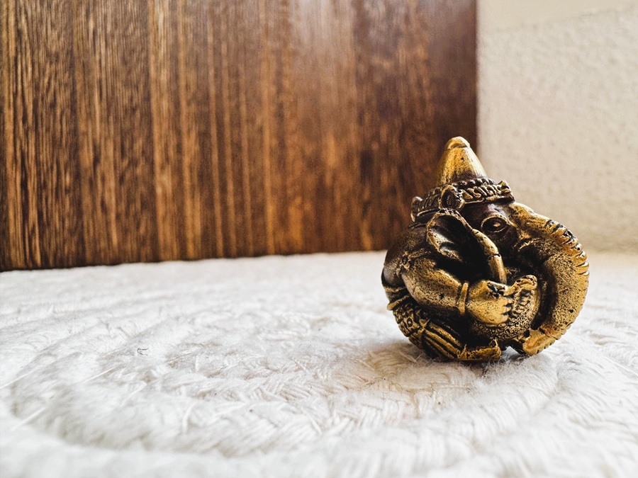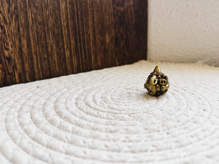 Figurita de latón de Gaṇeśa, procedente de India. Tiene 2,5 centímetros de alto, perfecta para que la lleves contigo a modo de amuleto si quieres. Se entrega con el Ebook de Gaṇeśa, para que conozcas su historia, sus mantras y simbolismo, y la recibirás en una bolsita de tela de sari hecha a mano para protegerla cuando te la lleves.