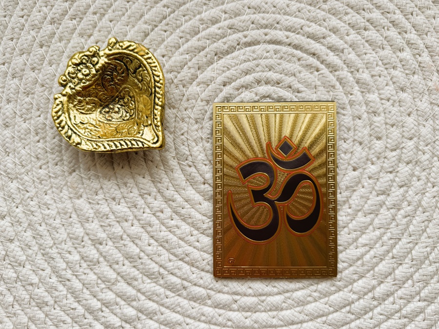 Imán de nevera de color dorado brillante y relieve. El tamaño es de 6×8,5 cm.
